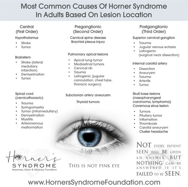 Horner syndrome is caused by damage or disruption of the nerves connecting the brain the face and the eyes. The common causes for children with Horners syndrome include. What Is Horner Syndrome. Horners syndrome is a condition caused by damage to the nerve pathway that leads from the brain to the eye and face on the affected side of the body. Neuroblastoma which is a tumor in the hormonal and nervous systems injury during birth to their shoulders or neck a defect of the. HS may be a subtle sign of occult pathology in otherwise asymptomatic children neuroblastoma NBL being the the most common associated malignant tumour. In about 5 percent of affected individuals.