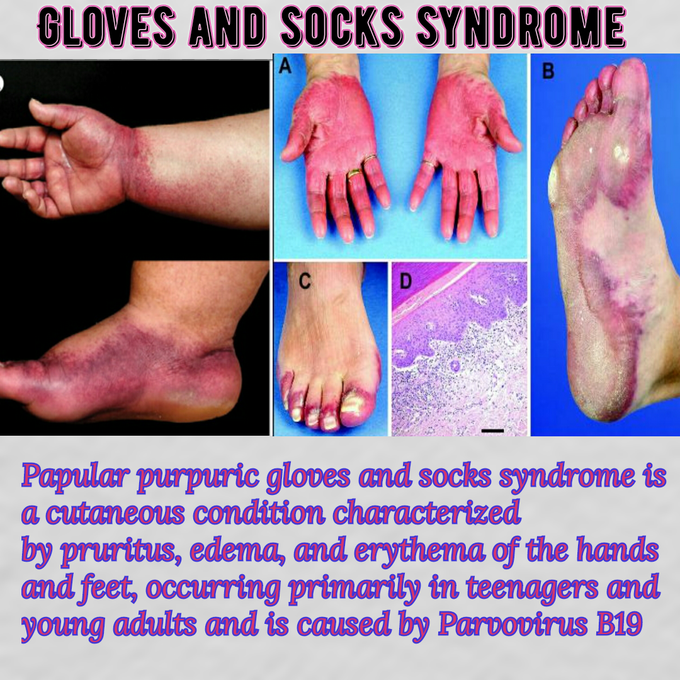 Papular-purpuric gloves and socks syndrome PPGSS is a distinctive self-limited dermatosis first described in the dermatologic literature in 1990 175. Papular purpuric gloves and socks syndrome also known as gloves and socks syndrome is a relatively newly described viral dermatosis with unique characteristics. Papular-purpuric gloves and socks syndrome is a distinctive viral rash characterised by painful redness and swelling of the feet and hands.