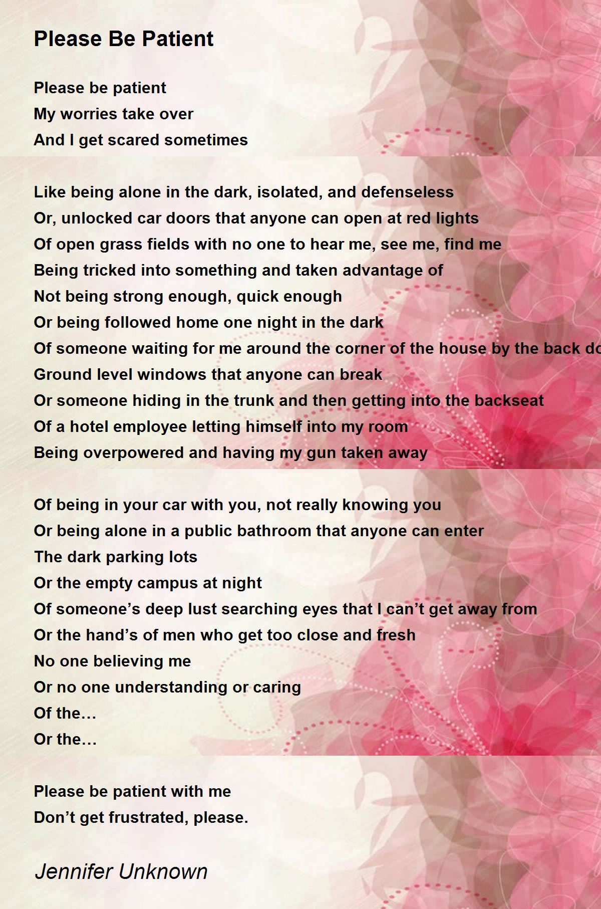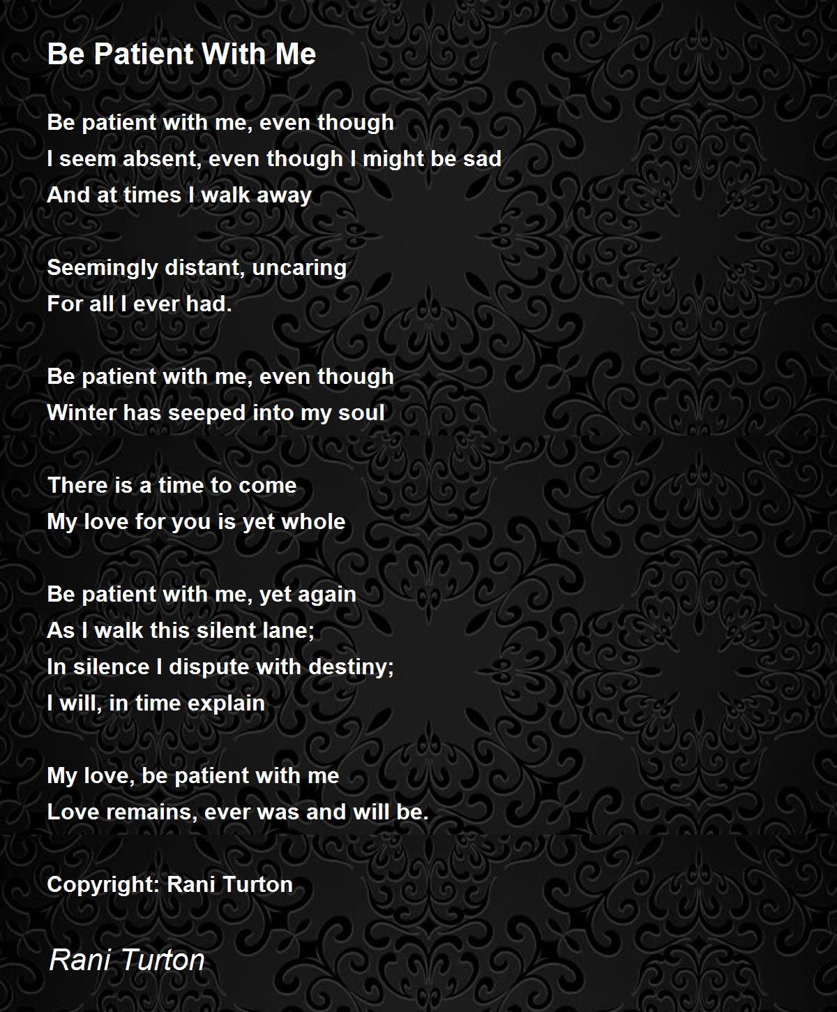 Verse If you should see me and Im not walking right and if you should hear me and Im not talking right. Man but I no longer put pressure on him. If you can hear me and Im not talking right. Please Be Patient with Me. Patient With Me Lyrics. Please Be Patient God Isnt Finished with Me Yet. Her hand flew to it immediately and she could feel the slightly raised imprint of the name now on.