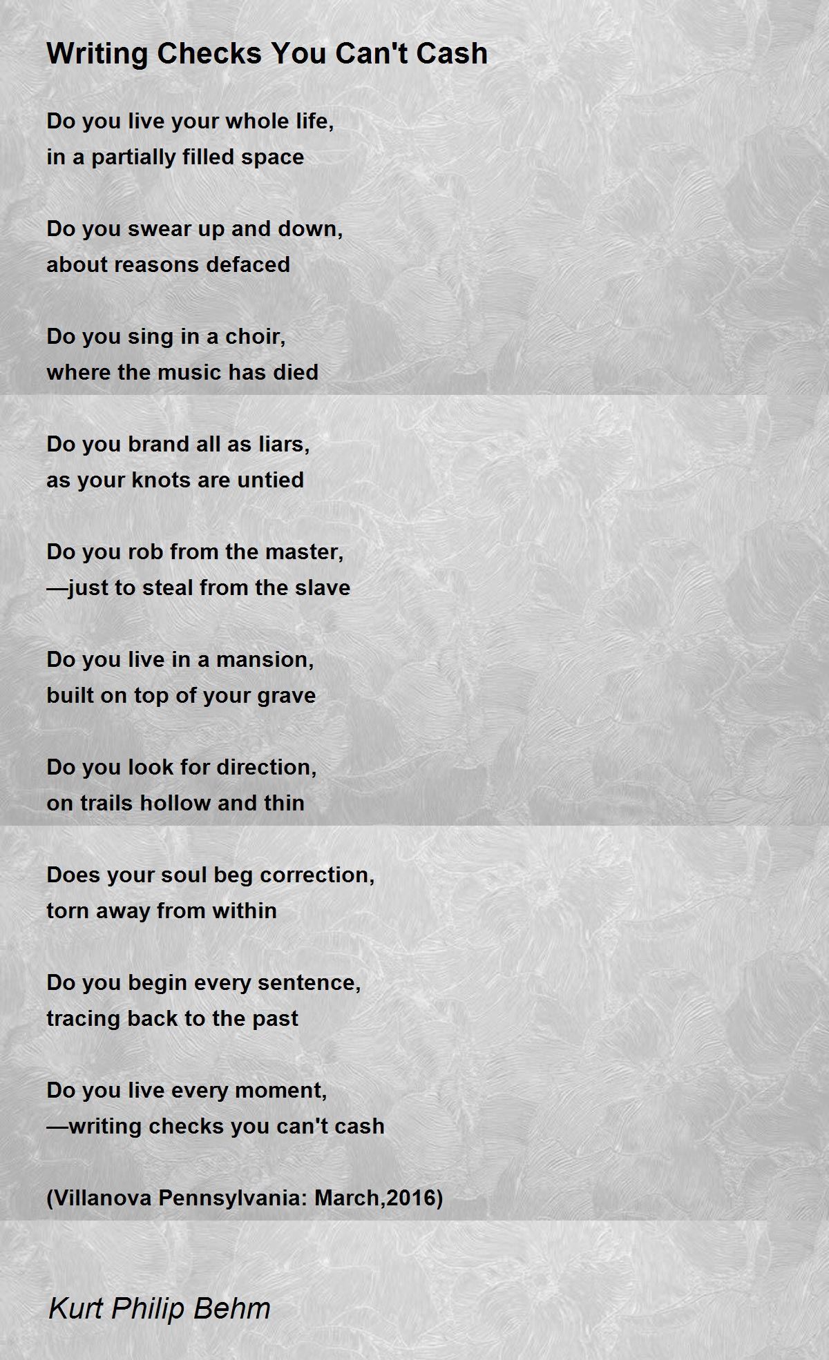 Writing checks you cant cash. Cash While this can be convenient it also means the check can be cashed or deposited by anybody. Comedian Flip Wilson 1933-1998 used the line on television while performing in drag as the character Geraldine. That phrase has been rolling around in my head for a month.